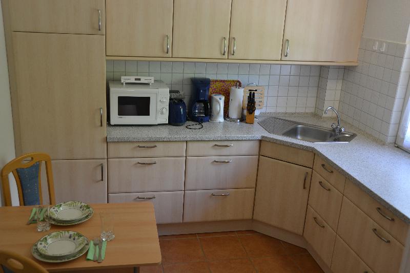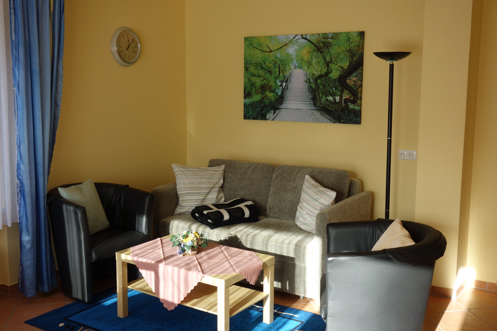 Ihre Wohnung befindet sich im EG. Zu ihrer Verfügung steht ihnen ein Wohnzimmer mit Fernseher sowie ein Radio mit CD-Player. Einem gemütlichem Sofa mit Schlafmöglichkeit sowie einem Essplatz für 3 Personen. Und einem Schlafzimmer mit Doppelbett. Die im Wohnzimmer integrierte Küche lässt mit einem 2 Platten Kochfeld, Mikrowelle, Toaster, Wasserkocher und Kaffeemaschine keine Wünsche offen.